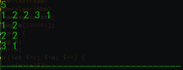 4.若哨兵与第i(2~N)个元素不相等,则输出哨兵值与当前的计数值,并将哨兵更换当前的元素,并使计数值为1