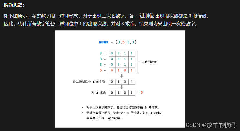 以上就是笑点低枕头最近收集整理的关于LeetCode(剑指 Offer)- 56 - II. 数组中数字出现的次数 II的全部内容,更多相关LeetCode(剑指内容请搜索靠谱客的其他文章。