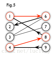 - 增广路径–从一个未匹配点出发,走交替路,如果途径另一个未匹配点(出发的点不算),则这条交替路称为增广路(agumenting path)。这里直接截的图,图 5 中的一条增广路如图 6 所示(图中的匹配点均用红色标出):