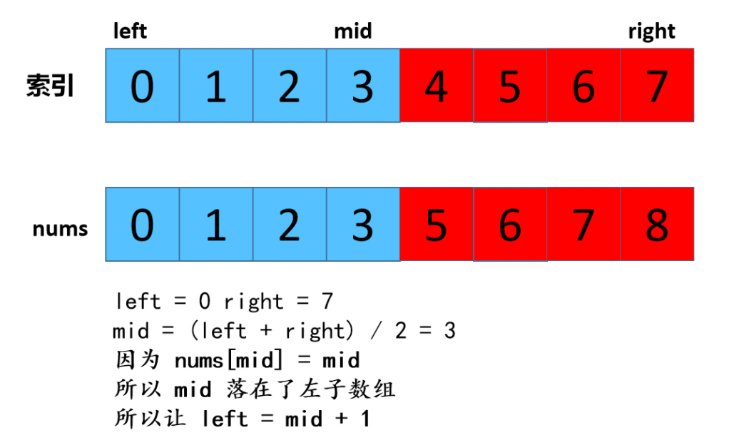5.当我们判断缺失的元素在右边时候,这时候区间就是[mid + 1,right];