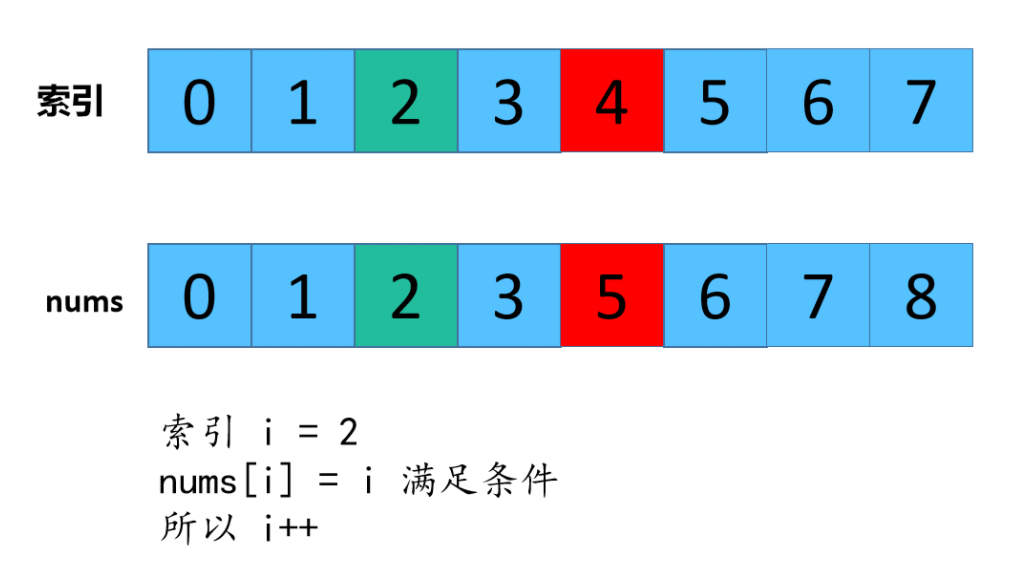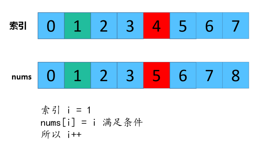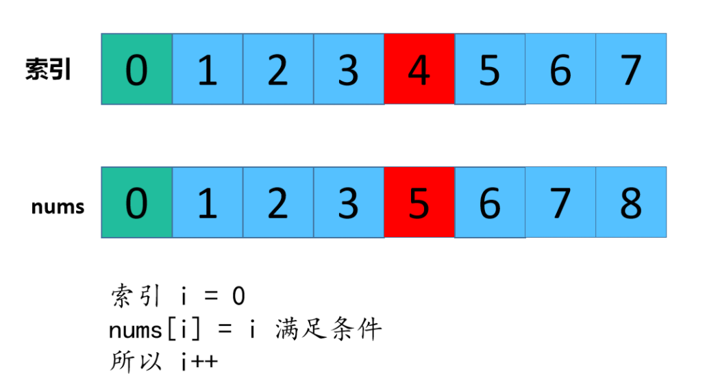 nums[midI] === midI ? leftI = midI + 1 : rightI = midI - 1