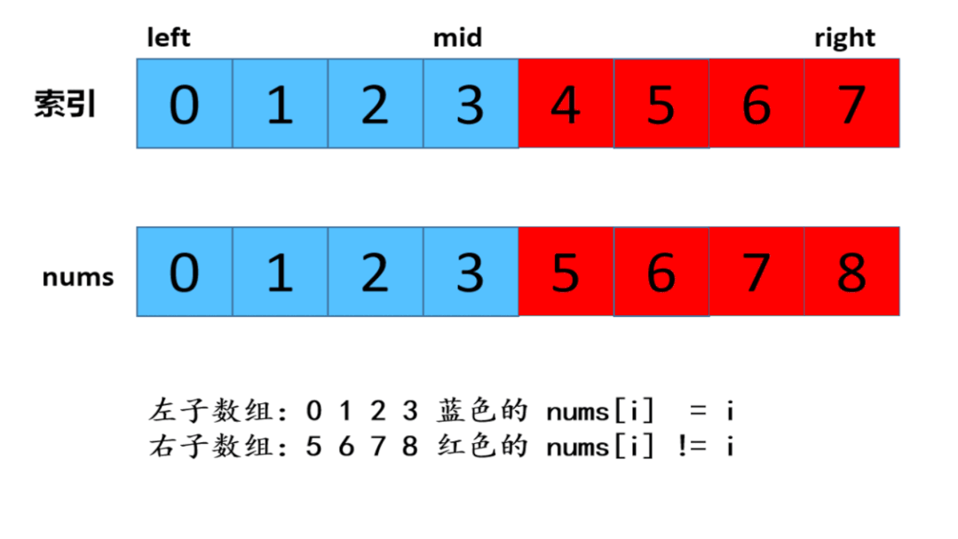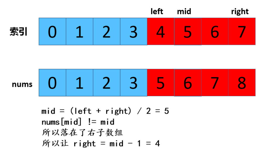 4.判断nums[mid] == mid 虽然数组元素是缺失的 但是下标是完整,如果 nums[mid] == mid 说明缺失的元素在右边,否则相反。