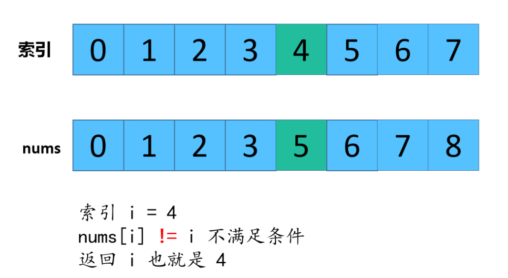 这道题题目本质是找到第一个数组下标和数组中的数不匹配的,如下图中的例子,是数组下标为4的时候,数组中的数应该是4。