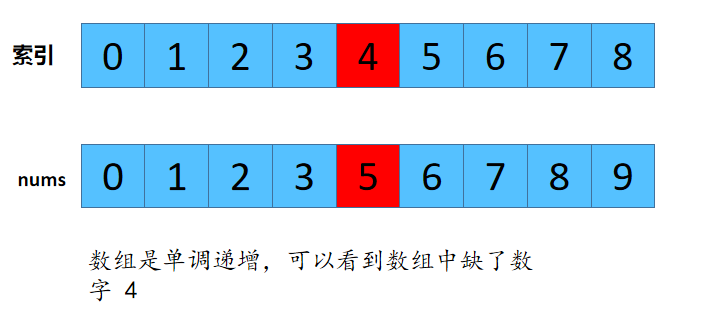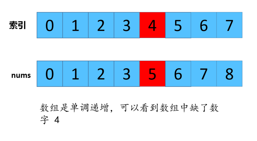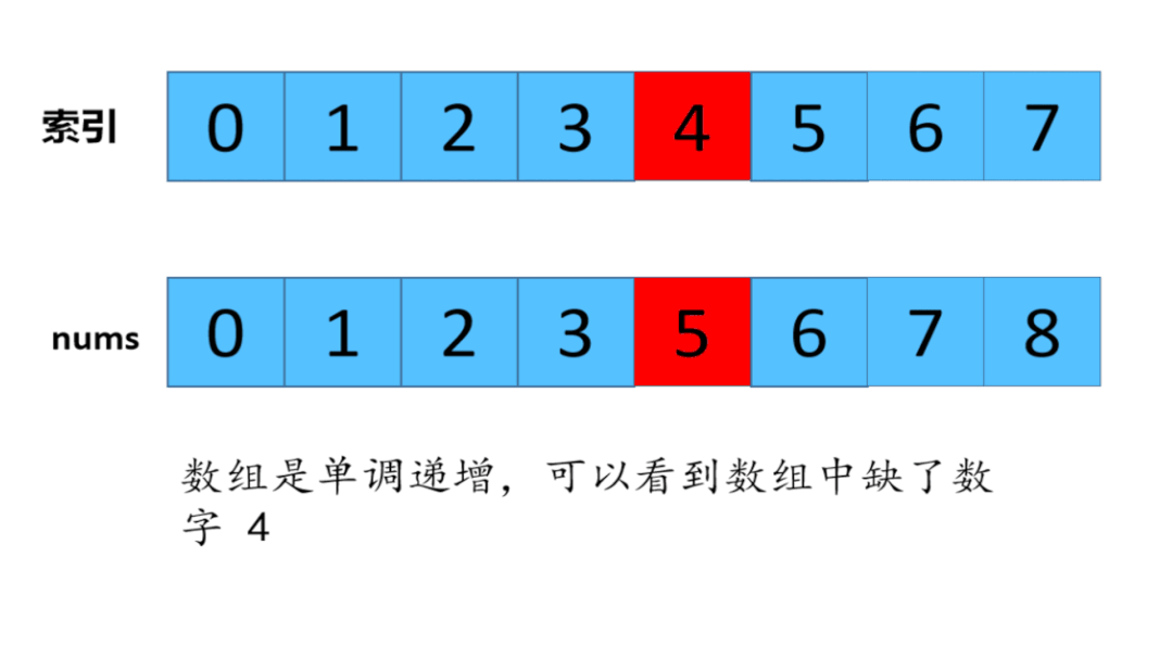 阅读题目,数组是单调递增的,而且数字是无重复的,所以缺失一个数字的话,就导致数组的下标和数组的数字没对应上。