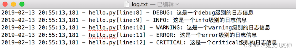 2020-12-28 17:15:07 - MyLog - WARNING - c:UsershpDesktop测试.py - 14: 这是警告级别的日志信息