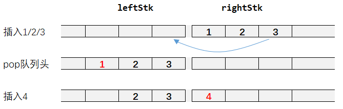 栈先进后出,队列先进先出。为了直观表示,我们定义2两栈, leftStk (用来取出元素) 和 rightStk(用来存放元素), 所以,在pop时,需要把rightStk种的元素全部倒到 leftStk中,只要leftStk中还有元素,就从leftStk中取出,而rightStk主要用来存放元素。图示如下。