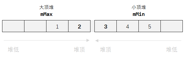 return (mMax.top() + mMin.top()) / 2.0; // 有的地方中值定义成索引为(n-1)/2的元素,则return mMax.top();