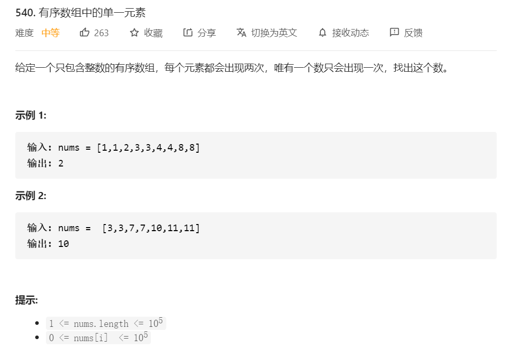 200道大数据面试常考Leetcode算法题 (二分查找篇)540-有序数组中的单一元素