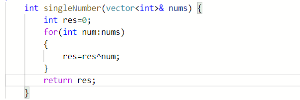 所以不难理解对整个数组的每个元素挨个异或运算,最终得到的一定的只出现一次的元素,因为其余元素都通过性质3,性质2与自身发生异或得到结果0,然后由性质1可得到只出现一次的元素。