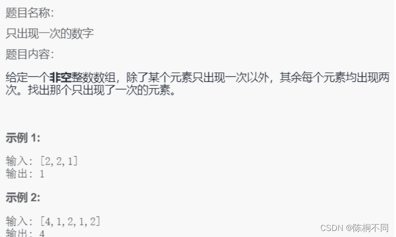 以上就是感动荔枝最近收集整理的关于给定一个非空整数数组,除了某个元素只出现一次以外,其余每个元素均出现两次。找出那个只出现了一次的元素。的全部内容,更多相关给定一个非空整数数组,除了某个元素只出现一次以外,其余每个元素均出现两次。找出那个只出现了一次内容请搜索靠谱客的其他文章。
