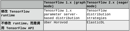 其中需要修改 TensorFlow runtime 的工作主要由 Google TensorFlow 团队完成。因为 TensorFlow runtime 是用 C++ 写的,把网络通信和同步功能实现在这个层次里,运行效率很高。而且,理论上 C++ 代码可以通过感知 TCP/IP 链接是否中断,来判断进程是否挂掉,从而实现容错。