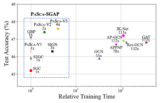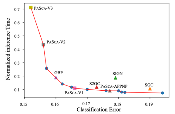 如图8所示,实验展示了PaSca系统在Cora数据集的搜索结果的帕累托平面。本文从中挑选了3个代表性的模型,分别命名为PaSca-V1, PaSca-V2和PaSca-V3。这些代表性模型能兼容不同的优化目标,比如PaSca-V3取得了最小的分类误差但是比PaSca-V2的预测时间更久。