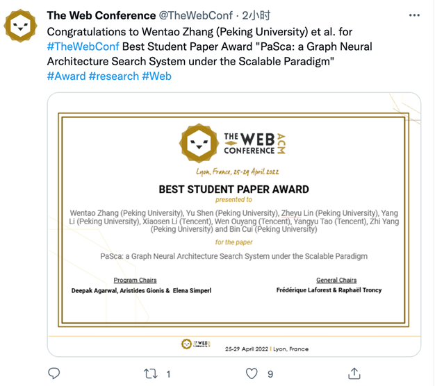 2022年4月29日晚,在线上举办的2022年国际万维网大会(The Web Conference,简称WWW)上,腾讯TEG机器学习平台部Angel Graph团队联合北京大学DAIR实验室的最新成果“可扩展范式下的图网络架构搜索系统 (PaSca: aGraph Neural Architecture Search System under the Scalable Paradigm)”获得大会唯一最佳学生论文奖(BestStudent Paper Award),北京大学-腾讯协同创新实验室主任崔斌教授也受邀在大会闭幕式上发表获奖感言。