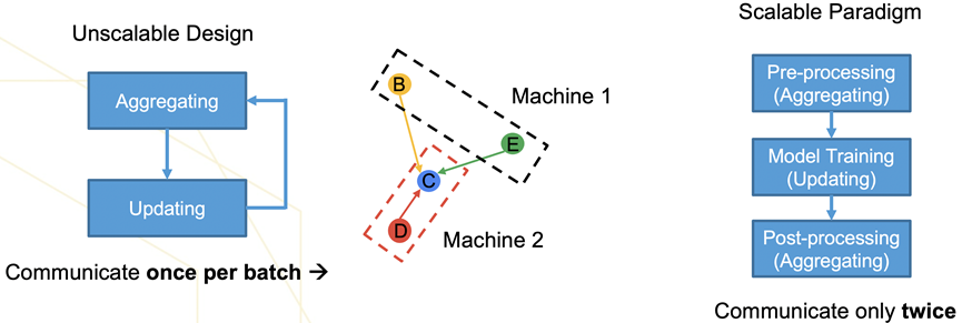 如图5所示,现有的图神经网络模型大都遵循如上图所示的消息传递机制。此外,为了兼容主流的图神经网络模型,相应的图神经网络系统也使用基于消息传递机制的系统抽象。然而,基于消息传播机制的图模型在每个batch训练过程中都需要进行聚合和更新操作。当图节点数据分布在不同机器上时,频繁的聚合操作会导致高昂的通信开销。区别于现有的消息传递机制,本文提出的Scalable Paradigm(SGAP)将消息聚合操作和更新操作分离,定义了可扩展性图神经网络建模的新范式:前处理—训练—后处理,消息聚合操作只存在于前处理和后处理中,极大地降低了分布式场景下的通信开销。
