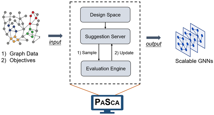 区别于现有的大规模图神经网络系统,本文提出的PaSca是一个端到端的系统。如图4所示,系统的输入有两部分组成:1)图数据 2)搜索目标(预测性能、内存占用、训练以及预测效率等)。给定这两个输入,系统能自动化地在预定义的可扩展图网络搜索空间进行高效地搜索,并输出能兼容多个搜索目标的可扩展图神经网络模型。