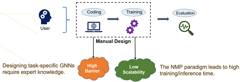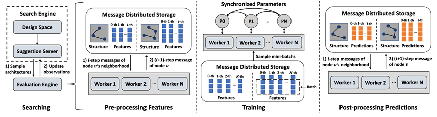 图神经网络模型在多个图任务上都取得了最佳效果,并受到了学术界和工业界的广泛关注。然而,现有的图神经网络系统有两个瓶颈。一方面,受限于单机场景下的存储和计算开销以及分布式场景下的通信开销,大多数基于消息传播机制的图神经网络模型可扩展性较低,很难直接用于工业界大规模图数据。此外,现有的图神经网络系统需要用户针对特定图数据和图任务编写代码和训练流程,然而设计网络结构也需要经验丰富的专家,建模成本很高。