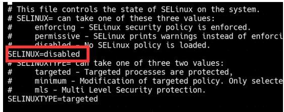 将SELINUX的值设置为disabled,(按i进入编辑模式,改成disabled后按esc。再输入:wq保存)