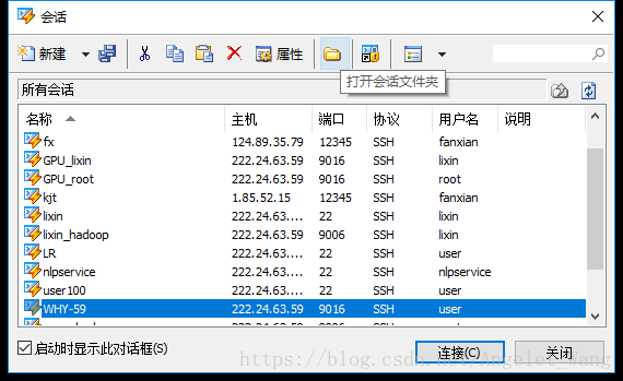 或者,若是想打开已经设置好的主机号个端口号的会话,则跳过第一步,点击第二个文件夹图标。如图: