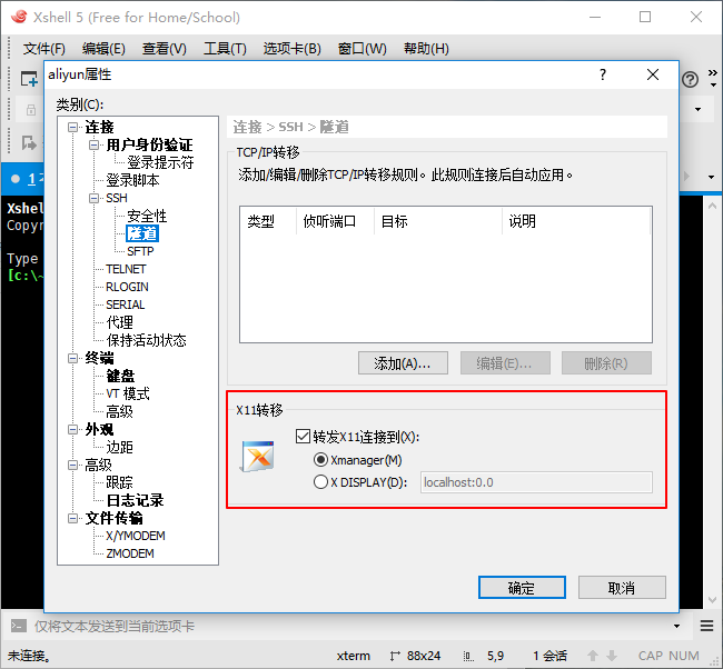 2.打开xshell,连接上linux服务器,并在建立连接时,设置连接属性,在 SSH –> tunneling(隧道) 选项下勾选 Forward X11
