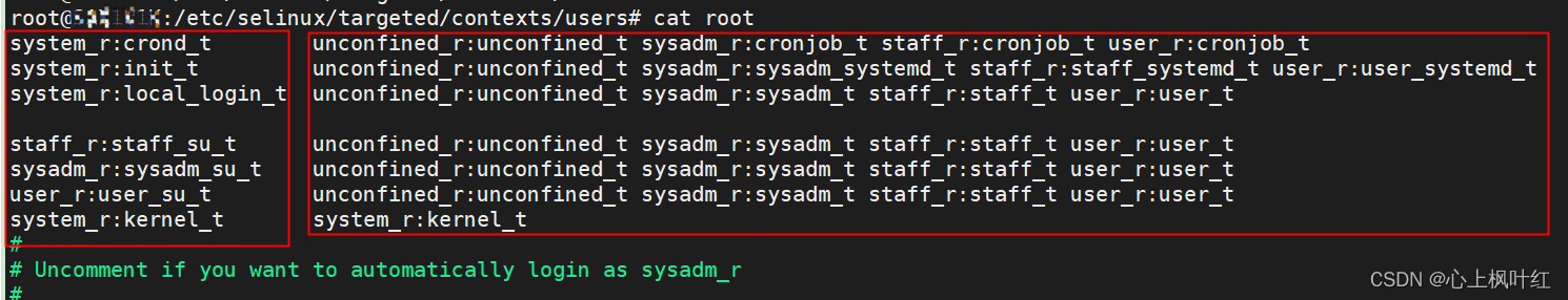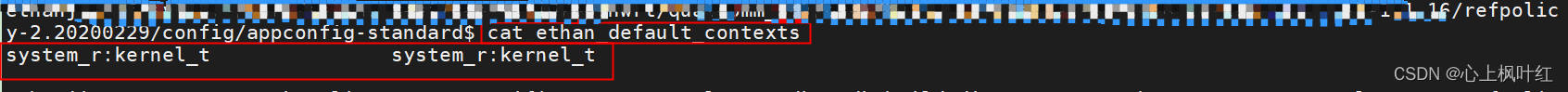 总结:1.在refpolicy-2.20200229/config/appconfig-standard/目录下新增XXX_default_contexts文件(XXX未新增的用户名),并在文件中配置需要的安全上下文权限(若已存在用户则直接修改或添加需要的安全上下文权限)。或在refpolicy-2.20200229/config/appconfig-standard/default_contexts文件中直接修改或添加需要的安全上下文权限。