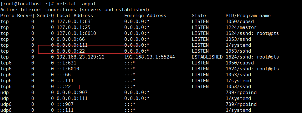 执行 > netstat -anput 看到有标红的 22 就说明配置成功, 如果 服务器重启了 22 端口不见了,就需要配置重启后自动启动 sshd
