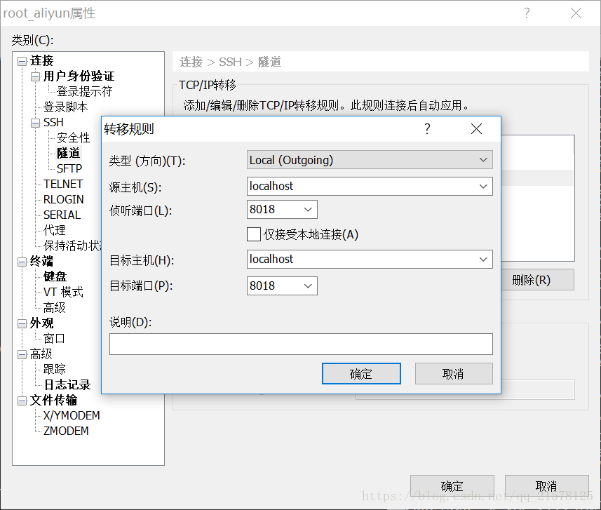 在SSH下选择隧道,添加TCP/IP转移,添加你要转移的端口,