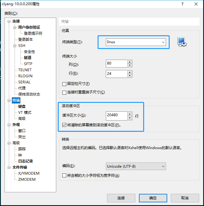 打开当前连接的属性→终端,选择终端类型为linux,缓冲区大小设置20480行,这样可以显示更多行内容。
