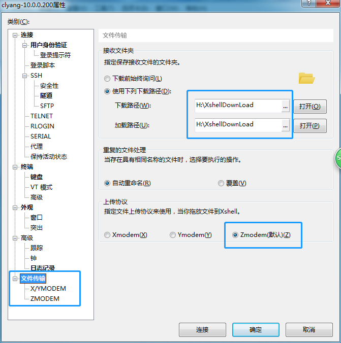 设置文件传输路径,建立本地文件夹,选择Zmodem协议