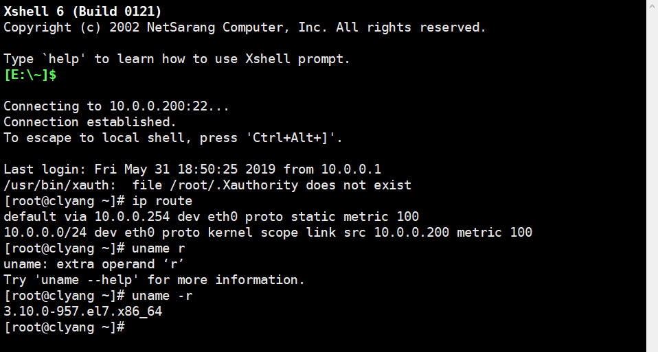 如下图输入了查看网关命令"ip route"和查看linux内核版本的命令"uname r"