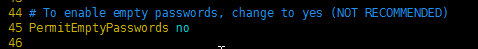 1) 将PermitEmptyPasswords yes前面的#号去掉