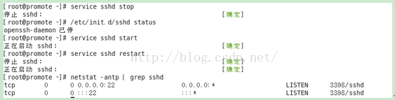 [service sshd stop] -> [/etc/init.d/sshd status] -> [service sshd start]-> [service sshd restart] ->[重启后可输入:netstat -antp | grep sshd 查看是否启动22端口]
