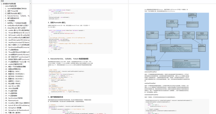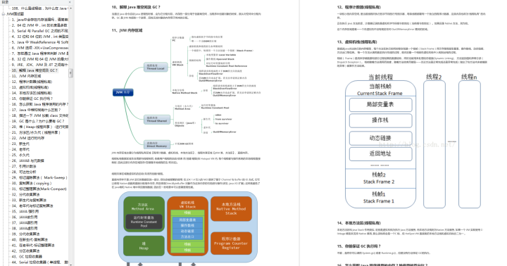 Java注解面试题2道 1、4种标准元注解是哪四种? 2、注解是什么? 多线程与并发面试题108道 1、Java中实现多线程有几种方法 继承Thread类; 实现Runnable接口; 实现Callable接口通过FutureTask包装器来创建Thread线程; 使用ExecutorService、Callable、Future实现有返回结果的多线程(也就是使用了ExecutorService来管理前面的三种方式)。 2、继承 Thread 类 Thread 类本质上是实现了 Runnable 接口的一个实例,代表一个线程的实例。 启动线程的唯一方法就是通过 Thread 类的 start()实例方法。 start()方法是一个 native 方法,它将启动一个新线程,并执行 run()方法。 public class MyThread extends Thread {public void run() { System.out.println("MyThread.run()"); } } MyThread myThread1 = new MyThread(); myThread1.start(); 3、实现 Runnable 接口。 如果自己的类已经 extends 另一个类,就无法直接 extends Thread,此时,可以实现一个Runnable 接口。 public class MyThread extends OtherClass implements Runnable {public void run() { System.out.println("MyThread.run()"); } } //启动 MyThread,需要首先实例化一个 Thread,并传入自己的 MyThread 实例:MyThread myThread = new MyThread(); Thread thread = new Thread(myThread); thread.start();//事实上,当传入一个 Runnable target 参数给 Thread 后, Thread 的 run()方法就会调用target.run()public void run() {if (target != null) { target.run(); } }