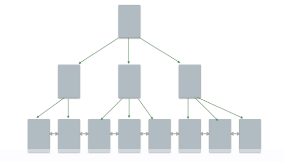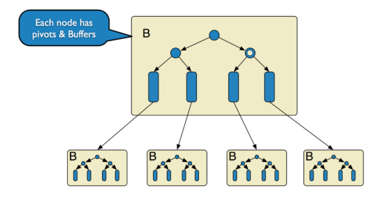适用场景: 1)经常更新的表,适合处理多重并发的更新请求。 2)支持事务。 3)可以从灾难中恢复(通过 bin-log 日志等)。 4)外键约束。只有他支持外键。 5)支持自动增加列属性 auto_increment。 3、TokuDB( Fractal Tree-节点带数据) TokuDB 底层存储结构为 Fractal Tree,Fractal Tree 的结构与 B+树有些类似, 在 Fractal Tree中, 每一个 child 指针除了需要指向一个 child节点外,还会带有一个 Message Buffer ,这个Message Buffer 是一个 FIFO 的队列,用来缓存更新操作。 例如,一次插入操作只需要落在某节点的 Message Buffer 就可以马上返回了,并不需要搜索到叶子节点。这些缓存的更新会在查询时或后台异步合并应用到对应的节点中。