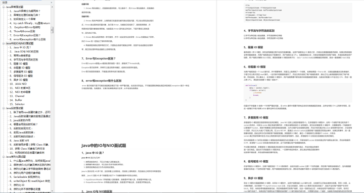 Java中的IO与NIO面试题15道 1、Java 中 IO 流? 2、 Java IO与 NIO的区别 3、常用io类有哪些 4、字节流与字符流的区别 5、阻塞 IO 模型 6、非阻塞 IO 模型 7、多路复用 IO 模型 8、信号驱动 IO 模型 9、异步 IO 模型 10、JAVA NIO 11、NIO 的缓冲区 12、NIO 的非阻塞 13、Channel 14、Buffer 15、Selector Java反射面试题11道 1、除了使用new创建对象之外,还可以用什么方法创建对象? 2、Java反射创建对象效率高还是通过new创建对象的效率高? 3、java反射的作用 4、哪里会用到反射机制? 5、反射的实现方式: 6、实现Java反射的类: 7、反射机制的优缺点: 8、Java 反射 API 9、反射使用步骤(获取 Class 对象、调用对象方法) 10、获取 Class 对象有几种方法 11、利用反射动态创建对象实例