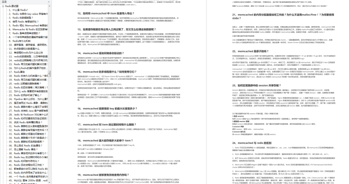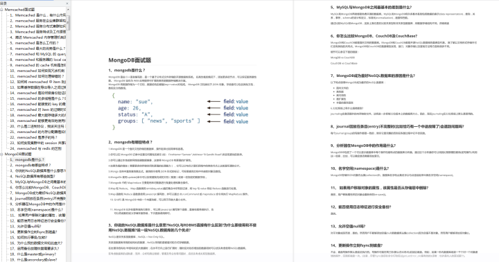Memcached面试题24道 1、Memcached 是什么,有什么作用? Memcached 是一个开源的,高性能的内存绶存软件,从名称上看 Mem 就是内存的意思,而 Cache 就是缓存的意思。Memcached 的作用:通过在事先规划好的内存空间中临时绶存数据库中的各类数据,以达到减少业务对数据库的直接高并发访问,从而达到提升数据库的访问性能,加速网站集群动态应用服务的能力。 2、Memcached 服务分布式集群如何实现? 特殊说明:Memcached 集群和 web 服务集群是不一样的,所有 Memcached 的数据总和才是数据库的数据。每台 Memcached 都是部分数据。(一台 memcached 的数据,就是一部分 mysql 数据库的数据) a、程序端实现 程序加载所有 mc 的 ip 列表,通过对 key 做 hash (一致性哈希算法) 例如:web1 (key)===>对应 A,B,C,D,E,F,G…..若干台服务器。(通过哈希算法实现) b、负载均衡器 通过对 key 做 hash (一致性哈希算法)一致哈希算法的目的是不但保证每个对象只请求一个对应的服务器,而且当节点宕机,缓存服务器的更新重新分配比例降到最低。 MongoDB面试题95道 1、mongodb是什么? MongoDB 是由 C++语言编写的,是一个基于分布式文件存储的开源数据库系统。 在高负载的情况下,添加更多的节点,可以保证服务器性能。 MongoDB 旨在为 WEB 应用提供可扩展的高性能数据存储解决方案。 MongoDB 将数据存储为一个文档,数据结构由键值(key=>value)对组成。 MongoDB 文档类似于 JSON 对象。字段值可以包含其他文档,数组及文档数组。