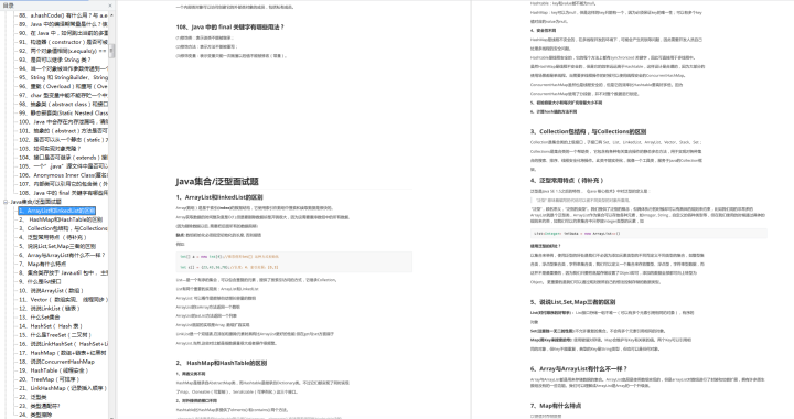 Java集合/泛型面试题24道 ArrayList和linkedList的区别 Array(数组)是基于索引(index)的数据结构,它使用索引在数组中搜索和读取数据是很快的。 Array获取数据的时间复杂度是O(1),但是要删除数据却是开销很大,因为这需要重排数组中的所有数据,(因为删除数据以后, 需要把后面所有的数据前移) 缺点: 数组初始化必须指定初始化的长度, 否则报错 例如: int[] a = new int[4];//推荐使用int[] 这种方式初始化int c[] = {23,43,56,78};//长度:4,索引范围:[0,3] List—是一个有序的集合,可以包含重复的元素,提供了按索引访问的方式,它继承Collection。 List有两个重要的实现类:ArrayList和LinkedList ArrayList: 可以看作是能够自动增长容量的数组 ArrayList的toArray方法返回一个数组 ArrayList的asList方法返回一个列表 ArrayList底层的实现是Array, 数组扩容实现 LinkList是一个双链表,在添加和删除元素时具有比ArrayList更好的性能.但在get与set方面弱于 ArrayList.当然,这些对比都是指数据量很大或者操作很频繁。