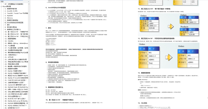 MySQL面试题83道 1、数据库存储引擎 数据库存储引擎是数据库底层软件组织,数据库管理系统(DBMS)使用数据引擎进行创建、查询、更新和删除数据。不同的存储引擎提供不同的存储机制、索引技巧、锁定水平等功能,使用不同的存储引擎,还可以 获得特定的功能。现在许多不同的数据库管理系统都支持多种不同的数据引擎。存储引擎主要有: 1. MyIsam , 2. InnoDB, 3. Memory, 4. Archive, 5. Federated 。 2、InnoDB(B+树) InnoDB 底层存储结构为B+树, B树的每个节点对应innodb的一个page, page大小是固定的,一般设为 16k。其中非叶子节点只有键值,叶子节点包含完成数据