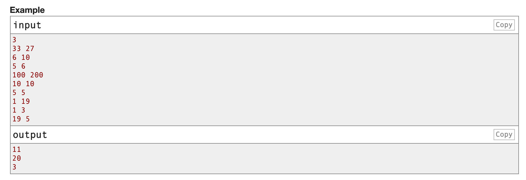 首先输入t,表示测试数据的组数。 1 ≤ t ≤ 1 0 4 1 leq t leq 10^4 1≤t≤104