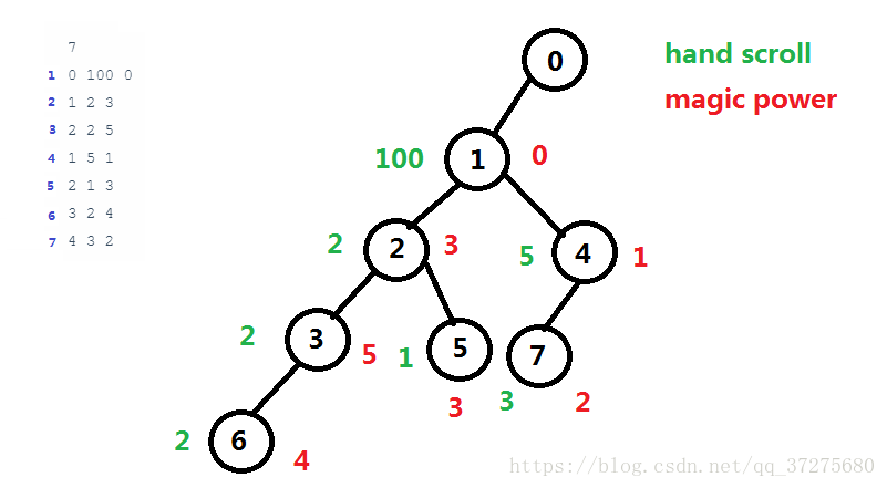 一个树形结构(根节点是0),给定每个节点的父节点的编号,手轴(hand scroll)个数,从该节点到父节点完成一次升级释放的能量。