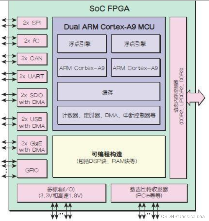 这个芯片是一种新的SoC(System on Chip,系统级芯片) FPGA,完全以硬内核方式实现的双路 ARM Cortex-A9 微控制器子系统(运行时钟高达 1GHz,包含浮点引擎,片上缓存,计数器,定时器等)以及种类广泛的硬内核接口功能( SPI, I2C, CAN等),还有一个硬内核的动态内存控制器,所有这些组件都利用大量传统的可编程构造和大量的通用输入输出( GPIO)引脚进行了性能增强。