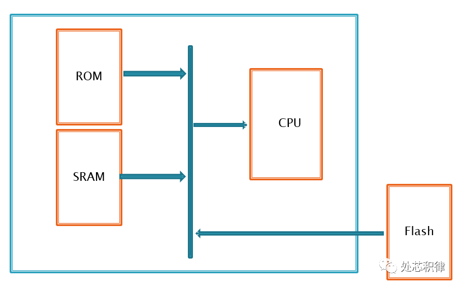 实际芯片的模块比这个最小系统复杂很多。存储介质上分为ROM,SRAM和Flash,一些大的芯片还有DDR等。