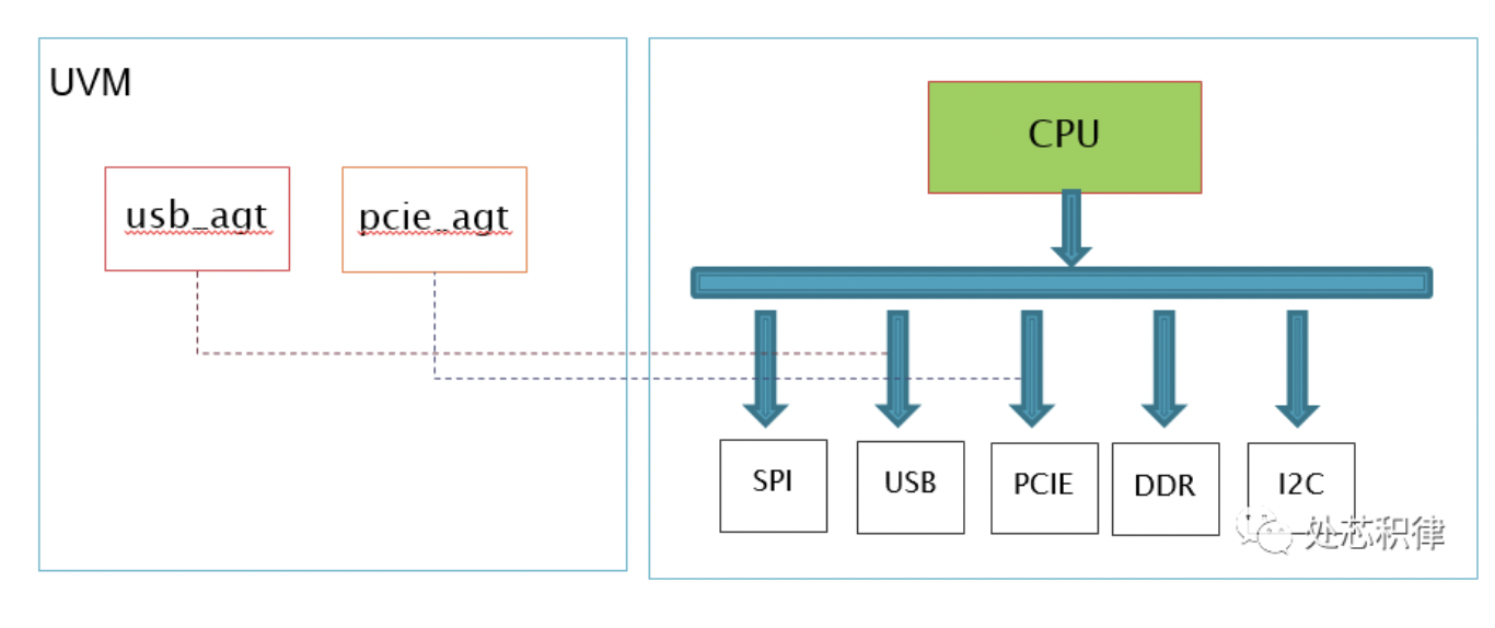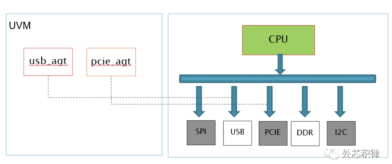 如上图所示,右边是一个SOC,CPU通过总线访问SPI,USB,PCIE,DDR,I2C等。在SOC验证环境里面,通过usb_agt 接管去往USB的总线,用pcie_agt接管去往PCIE的总线。当然也可以用chip_agt 接管CPU出来的总线。总而言之做法就是通过UVM去接管系统的总线。