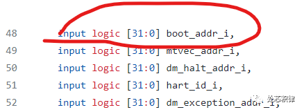 从上面的代码中可以看到,指令总线和数据总线都有地址和数据信号以及一些握手信号。在CPU reset之后,CPU会主动通过指令总线去某个特定的位置读取机器码。下图是CPU接口上一组输入信号,boot_addr_i 就是指令CPU reset 之后从哪里开始读代码。