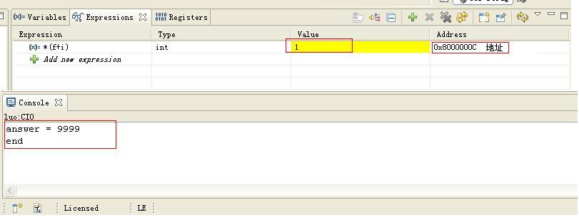 我们通过单步调试,将可以看到我们的指针f的地址与其所指的内存里int值。若我们不讲-heap定位于CE0,我们运行程序将会出错。