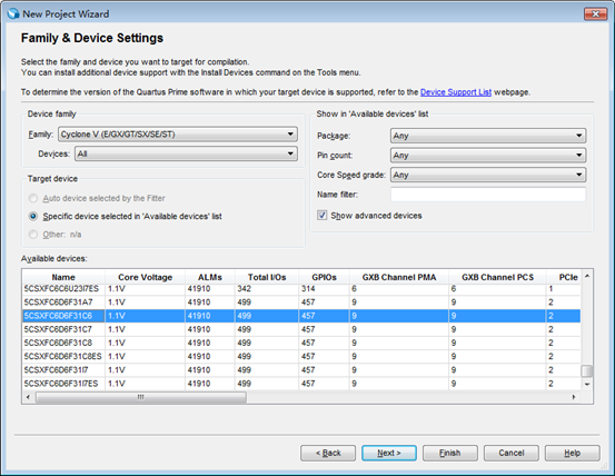 1.2 选择FPGA器件型号,如图2所示,DE10-Standard板载FPGA型号为5CSXFC6D6F31C6。