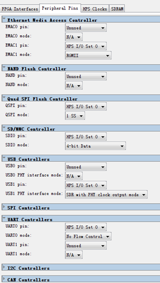 2)在Peripheral Pins页面中,设置HPS外设引脚复用及模式选择。设置如表1所示。设置完成后页面如图5所示。(本实验其实未用到这些外设)