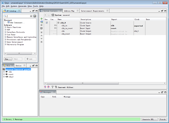 在Quartus软件中,通过菜单栏Tools->Qsys打开Qsys工具。刚打开的Qsys工具页面如图3所示。