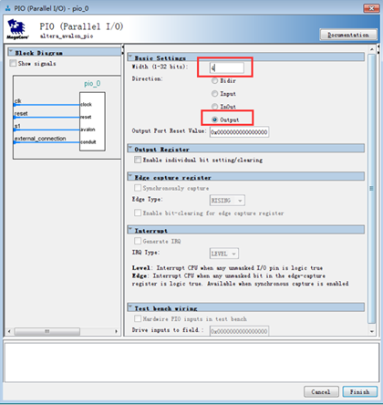 添加PIO外设。在IP目录中输入PIO,选中PIO双击添加外设,设置页面如图12所示,本实验通过PIO控制4个LED,故宽度为4。