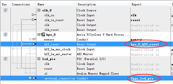 导出外设的顶层I/O接口。在Export一栏下相应位置双击,导出led_pio的顶层I/O接口,命名为fpga_led_pio,导出hps_0的h2f_reset接口,命名为hps_0_h2f_reset,如图13所示。